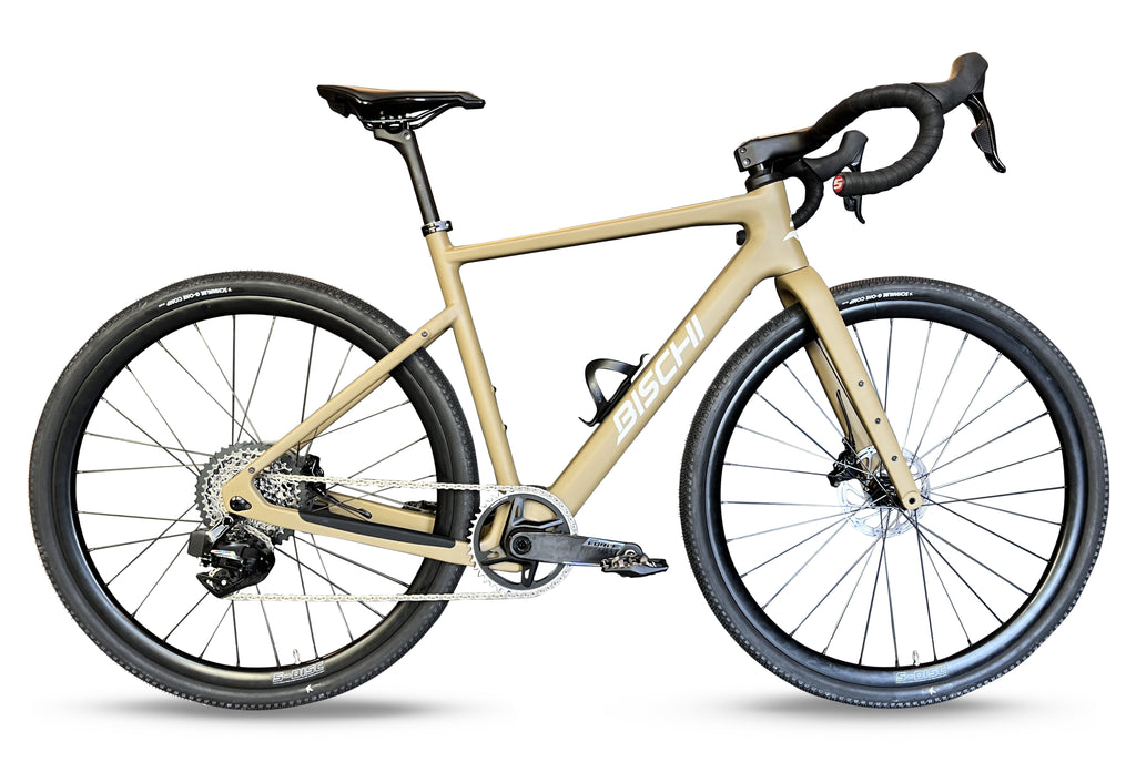 Das edle Carbon E-Gravel. Erst auf den zweiten Blick ist Erkennbar dass es ein Gravelrad mit Antrieb ist. Die Batterie und die Anschlüsse wurden gekonnt im Rahmen versteckt.